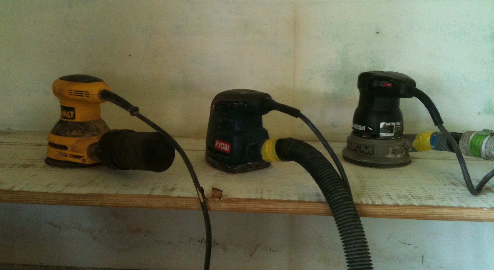 We set up my cabinet shop on the side of the back porch until this past weekend when the temperatures soared into the nineties. I moved into the air conditioned comfort of the living room and Michael hooked up the sanders to a vac. It’s a complicated system of hoses and extension cords and duct tape. He’s done it for me twice now, and the last time I was supposed to be paying attention so I could do it myself next time. I think I’ve got it. The biggest problem is that the two main sanders I use have different sizes of exhaust holes and I have to figure out which one goes where with what vacuum hose and they all get entangled with the extension cords. But Michael was the original Mr. Tool Guy–and he can always rescue me. The best part about the vacuum is that I can take off my breather mask! Always wear your safety glasses (AWYSG).