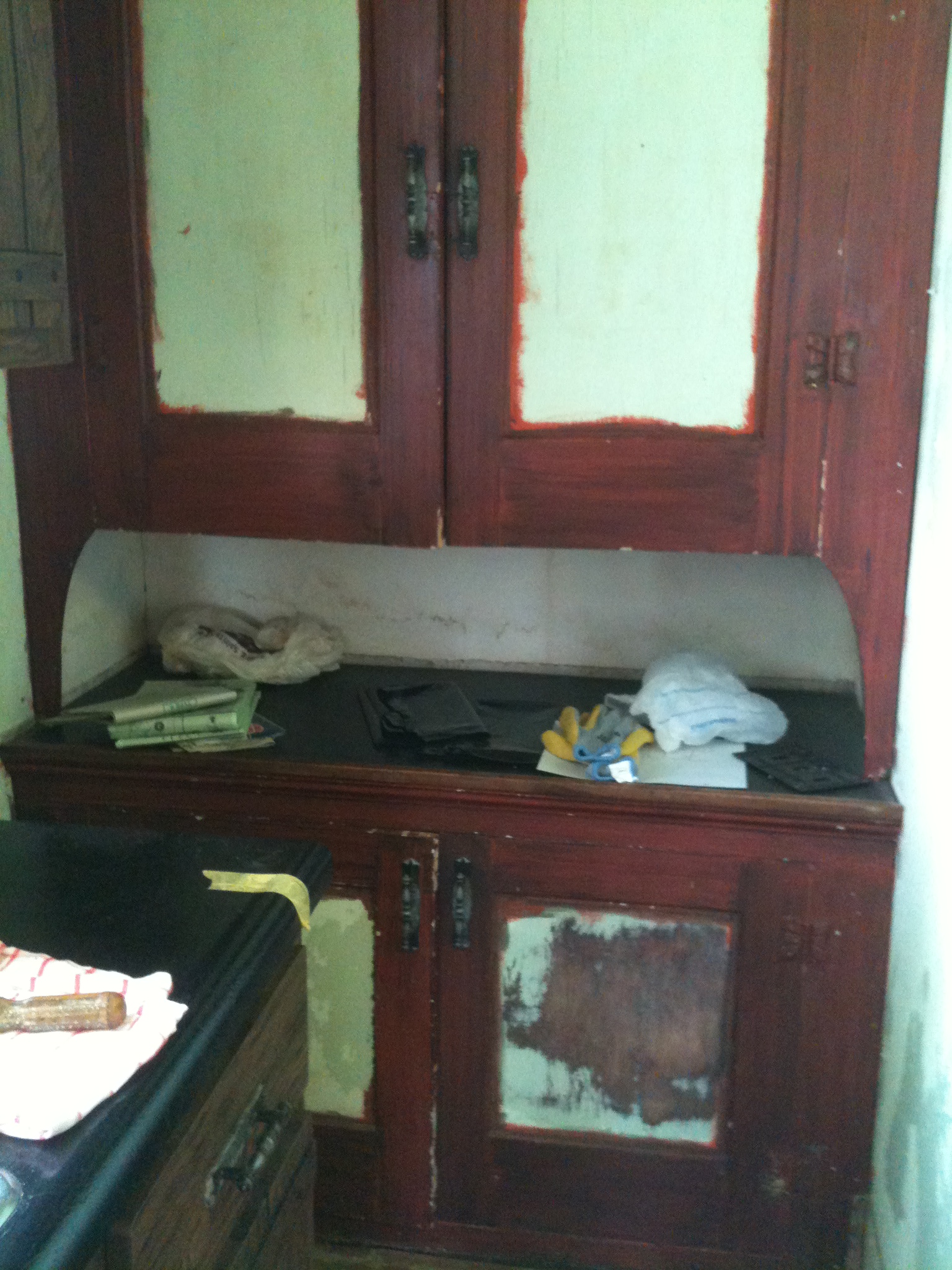 Fast forward to April/May of this year. A lot of stuff happened in between, and we’ll get to that in later posts, but for now, we are working on the kitchen. As in taking out walls–that’s a later post too–but for the past few weekends, I’ve been sanding. Not just smoothing rough edges, but taking off 4 coats of paint and the original varnish of kitchen cabinets. Oh did we dither about kitchen cabinets! They are so expensive, and I want white. The white cabinets that one can purchase at the BB stores are not wood; laminate, thermofoil, melamine, lacquer, acrylic–they have all sorts of fancy names and initials for what is really just junkboard. I’m a purist; I like real; I like old; I like authentic. So I wanted wood cabinets. The unfinished cabinets at Home Depot and Lowe’s were oak. It seemed a shame to buy oak cabinets and paint them white… So we haunted the Habitat for Humanity Restores in Washington and Edgewood and Construction Junction in Point Breeze. It took several visits in all places–and we found some other cool stuff in the meantime–but one day we came upon Really Ugly Cabinets. They were so ugly, we almost passed them right by.