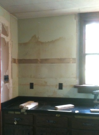 All those objects are now kaput. When the dark cabinet came off the wall, the whole kitchen lightened up! It was even better than we had hoped — who would have thought an ugly green wall with holes and stains would look so beautiful?