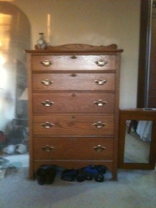 This is Clara’s oak dresser. It has to stay as is if used. (New hardware is okay.) 34″ x 18″ and 50″ high.