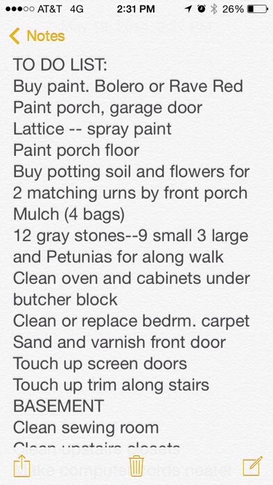 My old house “To-Do List” evolved into the “Unfinished Project List” so I threw it away. Now I just make a plan for the day. Today’s was to give my brain a rest from sorting through the mountian of files lurking in the basement for the past two weeks. I’m now “working” on my third NASCAR race of the weekend. I can assure you that the projects will wait an extra day/week/month/year/decade.