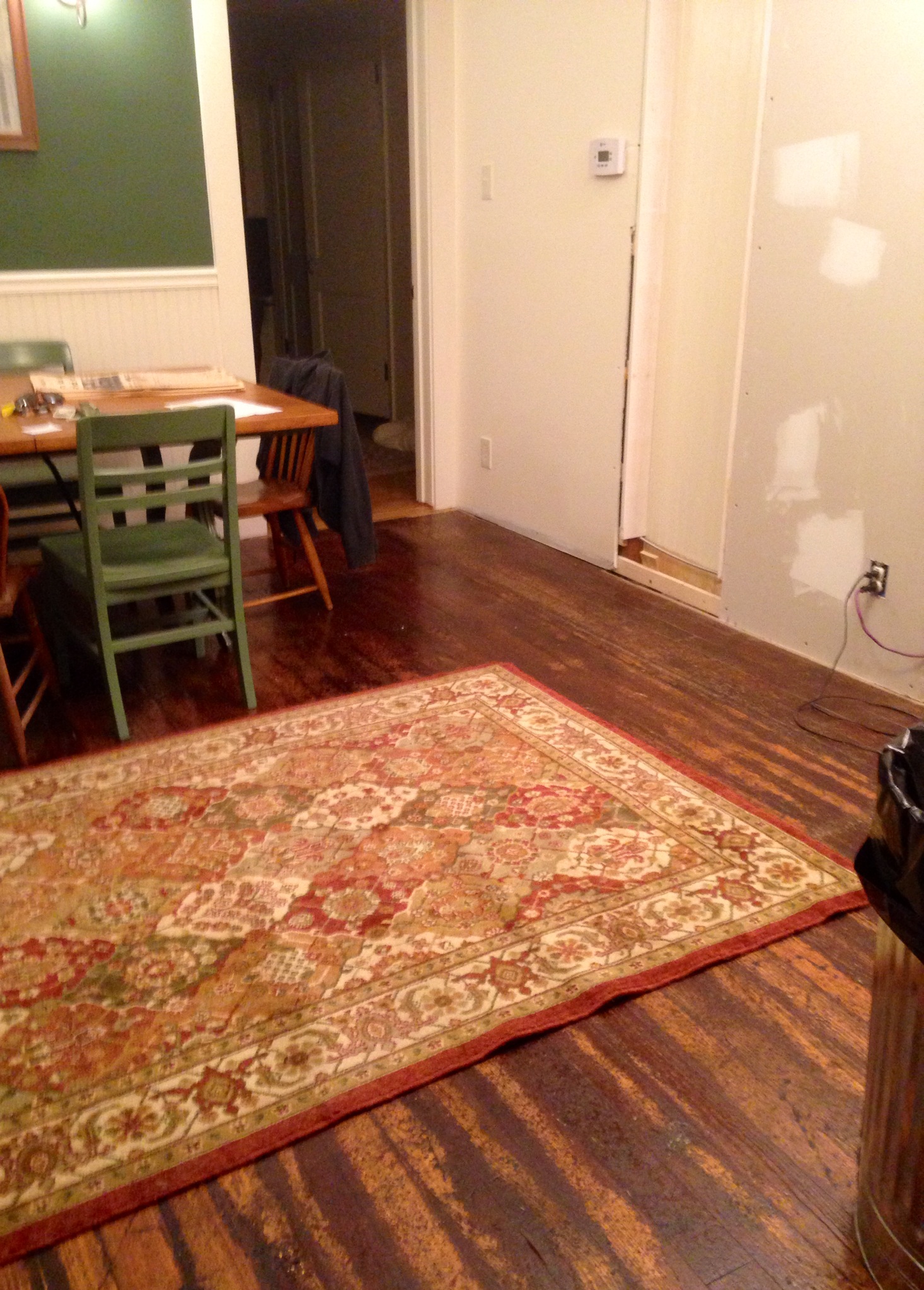 The long spot under the rocker is where the old wall to the little bedroom was. We were expecting that one. The area rug we couldn’t figure out though…