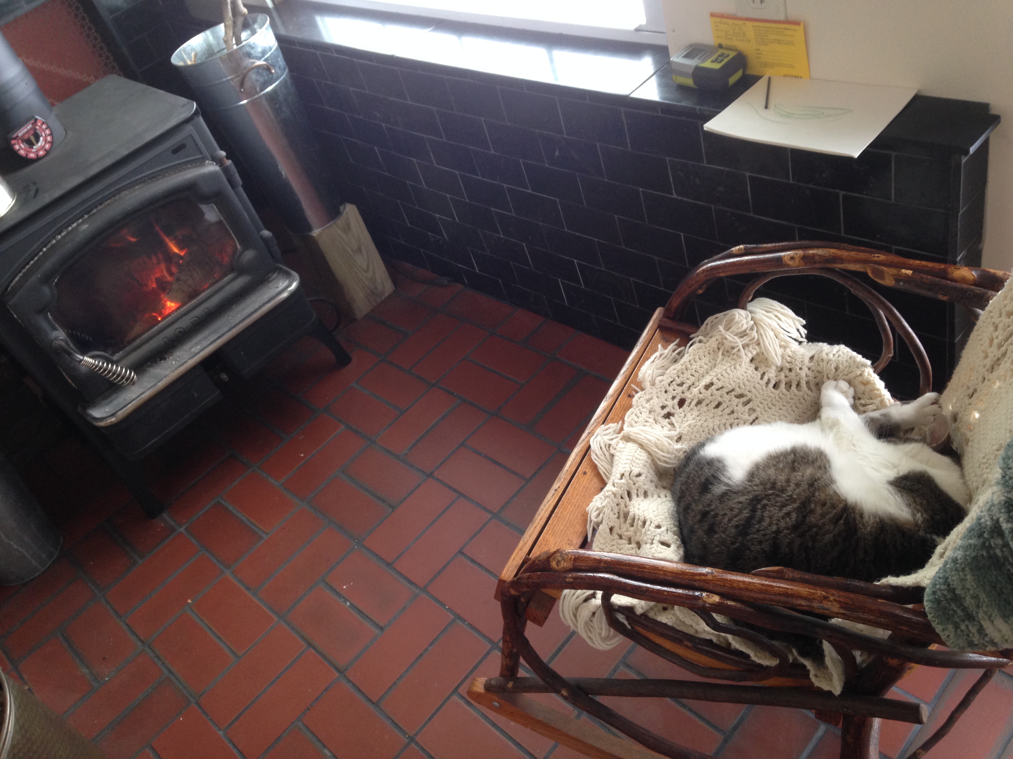 cat by the wood stove