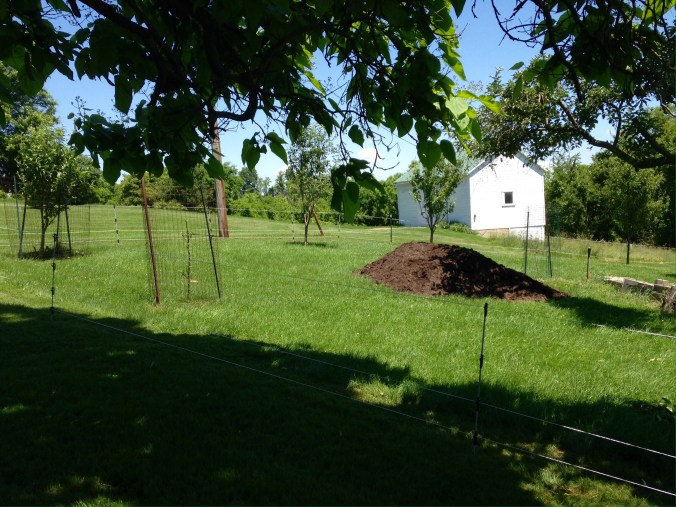 The new gate opens wide and the new fence keeps the fruit trees in and the riffraff critters out (so far).
