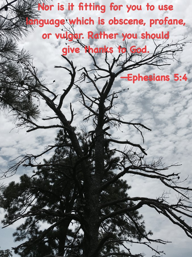 thirty biblical reasons to vote democratic in 2020: #12 Crude Language September 12, 2020September 20, 2020 / Apple Hill Cottage Let there be no filthiness nor foolish talk nor crude joking, which are out of place, but instead let there be thanksgiving. — Ephesians 5:4 (ESV) Not much else needs to be said about this, eh? Share this: Click to print (Opens in new window) Print Click to email a link to a friend (Opens in new window) Email Click to share on Pinterest (Opens in new window) Pinterest Click to share on Facebook (Opens in new window) Facebook Click to share on X (Opens in new window) X Click to share on Pocket (Opens in new window) Pocket Like Loading... Related