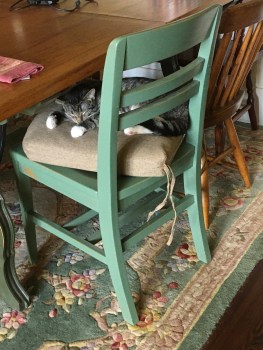 When a cat lives in a house that is still being renovated, she either has to take to the basement when the air compressor starts up (that’s what Henry did) or just be brave and become a construction cat. Mini, the skittish little kitty is fearless and nosy about all construction messes–she loves it when nails fall on the floor. She jumps on the desk, knocks off rolls of tape, and chases them all over the room. Yesterday I found her carrying a pair of tweezers around the house. Today she stole a fuzzy new mini roller cover and carried it around as if it was her own little kitten. (It was a fuzzy white little thing, after all.) And like all cats, she loves the fact that the furniture in the room gets moved around daily. And of course, after work, there’s always time for the nap.
