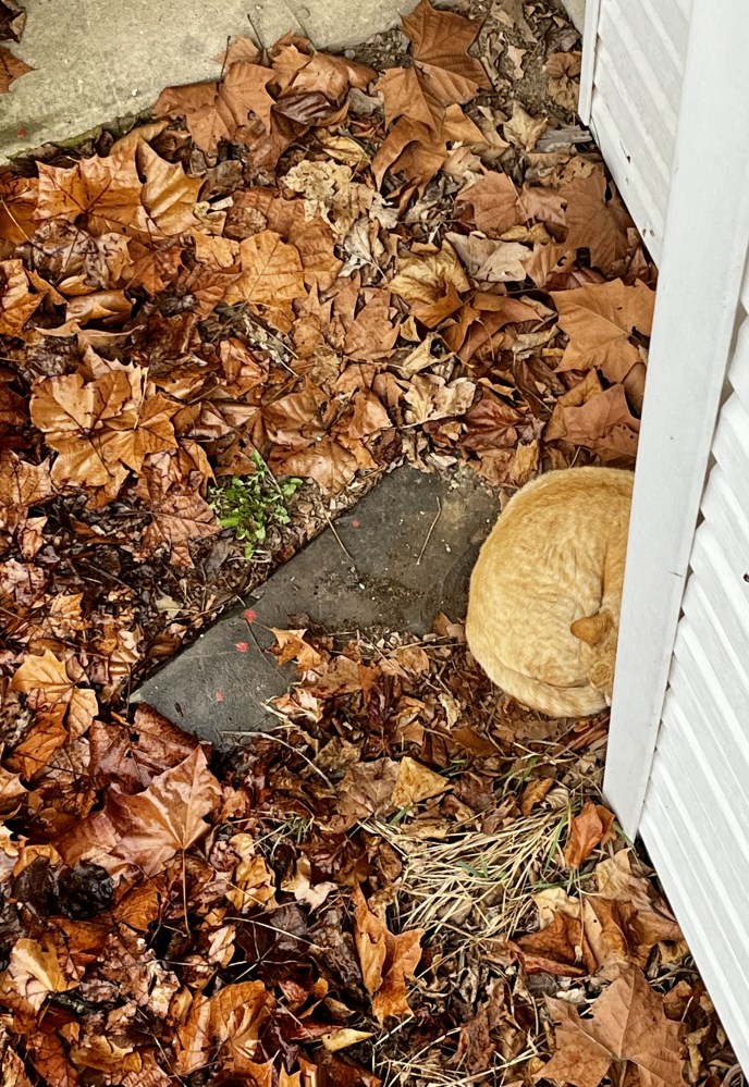 He showed up back in February as a streak of lightning dashing off the back porch and leaving the porch swing wildly crashing against the wall. I turned to Mr. H.C. and said, “I think there was just a cat sleeping on our porch swing.” About a week later we saw him again, curled up in a pile of leaves as close as he could get to the foundation.