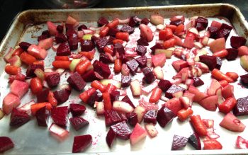 Have on hand: 4 beets, 3 carrots, a large onion, and 1-2 potatoes or parsnips, depending on size. Enough broth to cover vegetables; 2-3 tsp. Zatar; assorted spices (salt, pepper, cardamom, nutmeg, balsamic vinegar, olive oil, rosemary, 2 T. honey or agave syrup.)