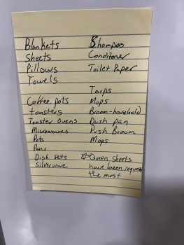 Unlike just the disaster relief organizations, CAP is in it for the long haul. They’ve been around for almost fifty years rebuilding houses, running youth camps, food pantries, thrift stores–and it’s mainly done with volunteers like you and me who give up a week or two, or a year or two of their lives. Before we left, the team there estimated that the Distribution Center at CAP would probably be open for several more months. Here was the list they tacked up on Friday, the day we left.