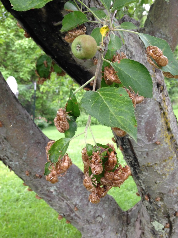 Periodical cicadas to be specific; and they decimated the young fruit trees we had nurtured. At the time it seemed to us a plague of biblical proportions, but all the trees survived, though not without damages. Then there was their recovery summer, and we were hoping last summer would be the year of the apples, but instead we had a week of 20 degree temperatures in May–and two days of snow–after all the trees had blossomed. The only fruit we had were a couple of quarts of blueberries. There are so many factors that can intervene to ruin apple crops: early blossoming, pollination failure, late frosts, too much rain, not enough rain, insects, deer… Even when there are apples on the tree, they can be lost or ruined by June drop, scab, insects, and various blights. Bounty and scarcity, plenty and want.