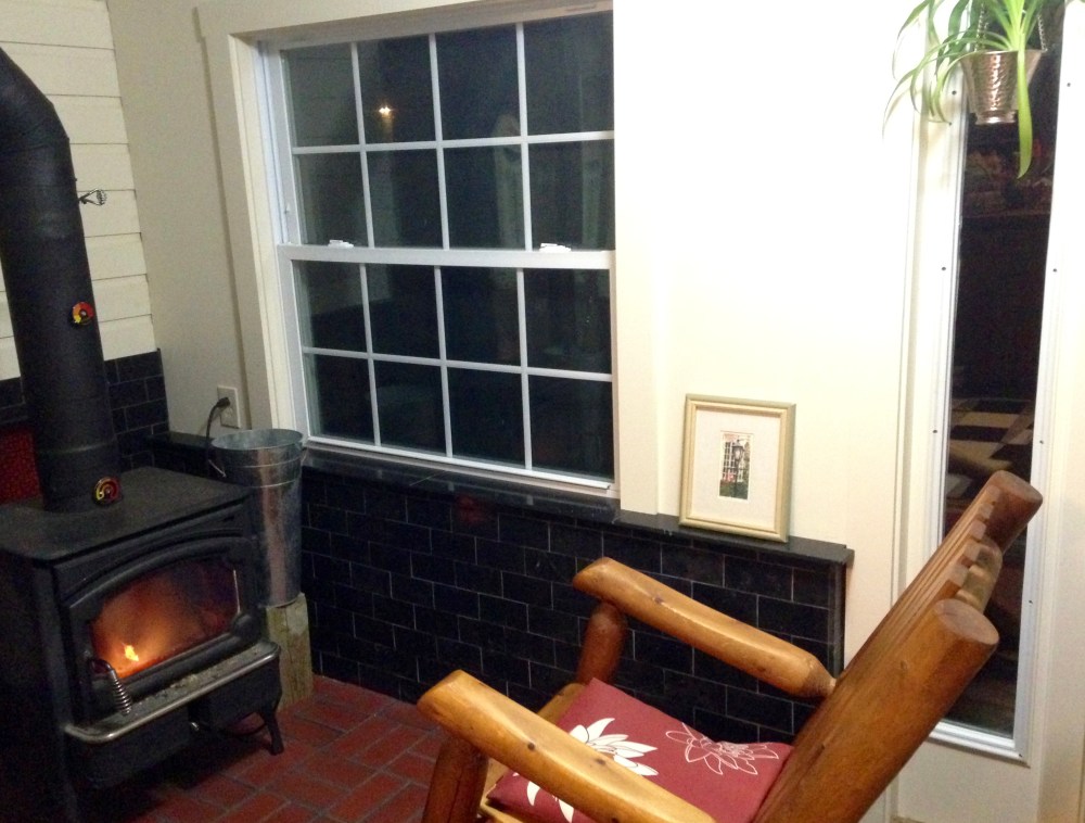 We collected things in a hodgepodge fashion: terracotta tiles for the floor and a new entry door from a Habitat for Humanity Restore; small French doors to open into the kitchen from Construction Junction; a wood stove for the corner that was in the basement of the city house. I repurposed the top part to an old desk and painted it green to coordinate with the kitchen, and it is now a combined shelving unit and coat rack for one wall. We have done this mudroom one wall at a time, at about the speed of one wall per year. Including the floor. Including the ceiling. What was once the three-year plan turned into five years.