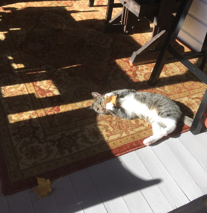 The cold nights have forced Tommy Orange to come inside. On the cold rainy days he doesn’t want to go outside, but he isn’t quite ready to be a house cat either. He’s in transition–unhappy in both places and quite grouchy. A far cry from the sweet lovable cat we adopted. Perhaps he just hates November too?