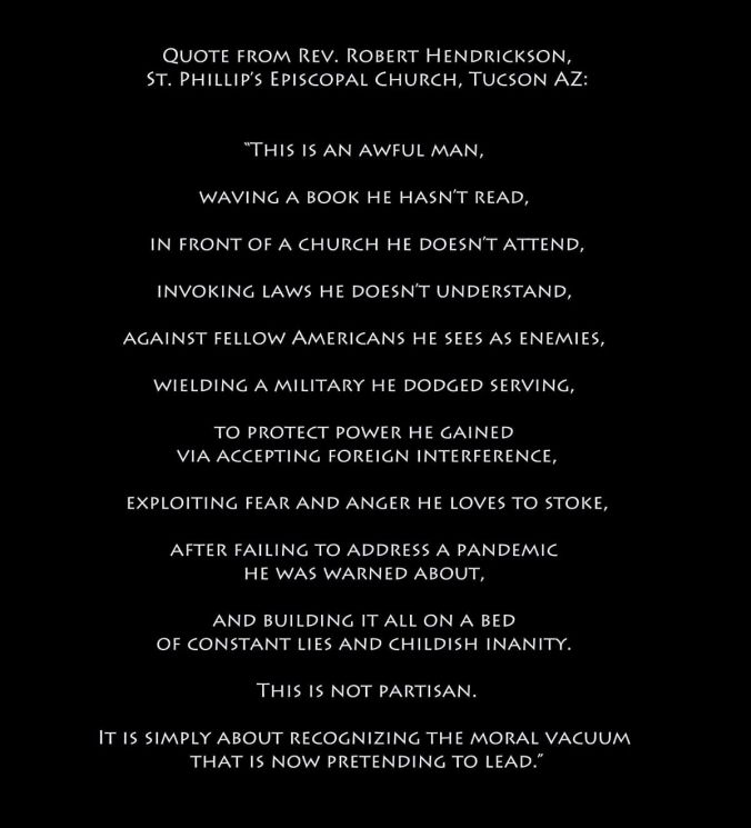 If you remember this photo op, you’ll remember that in a controversial move, the National Park police used tear gas to disperse the crowd of peaceful protesters in front of the White House, so he could walk across the street to a church and hold up a Bible. I’m not sure what he was trying to get across. That he believes in freedom of religion? That he believes in the Bible? That he thinks the Bible supports his ‘law and order’ ticket? That he likes his Christian supporters and wanted to pander to them? That he wasn’t hiding in the basement bunker of the White House, he was upstairs reading the Bible? Even when I try not to be cynical about this, I don’t get it. It offended many believers, including Rev. Robert Hendrickson whose words are below: