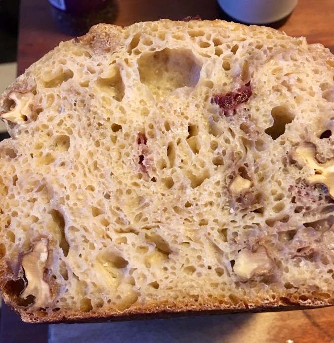 Early in the Sourdough experiments I came across this Cranberry Walnut Sourdough recipe at The Perfect Loaf. It was labeled Beginner. The recipe, printed out, is 4 pages. I put it away, terribly intimidated by all those words I didn’t know. And I happily tried other, simpler, sourdough recipes that were closer to what I knew. None of the results were a bread-lover’s dream. They were edible, particularly when toasted, but I wanted more. (Especially because Mr. H.C. got me an Emile Henry bread pan for Christmas and I wanted to do it justice. Can’t have mediocre bread coming from an expensive pan…)